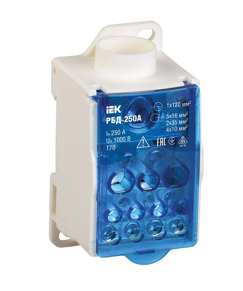 Распределительные блоки РБД предназначены для использования в качестве клеммного зажима при подключении к проводнику большего сечения нескольких проводников меньшего сечения, для создания упорядоченных систем распределения в шкафах, для организации главной заземляющей шины.Предназначены для монтажа на DIN-рейку или на монтажную панель как в силовых шкафах, так и в квартирных распределительных щитах, для работы в сетях с напряжением до 1000 В частоты 50 Гц при температуре окружающего воздуха от –40 до +70 С.