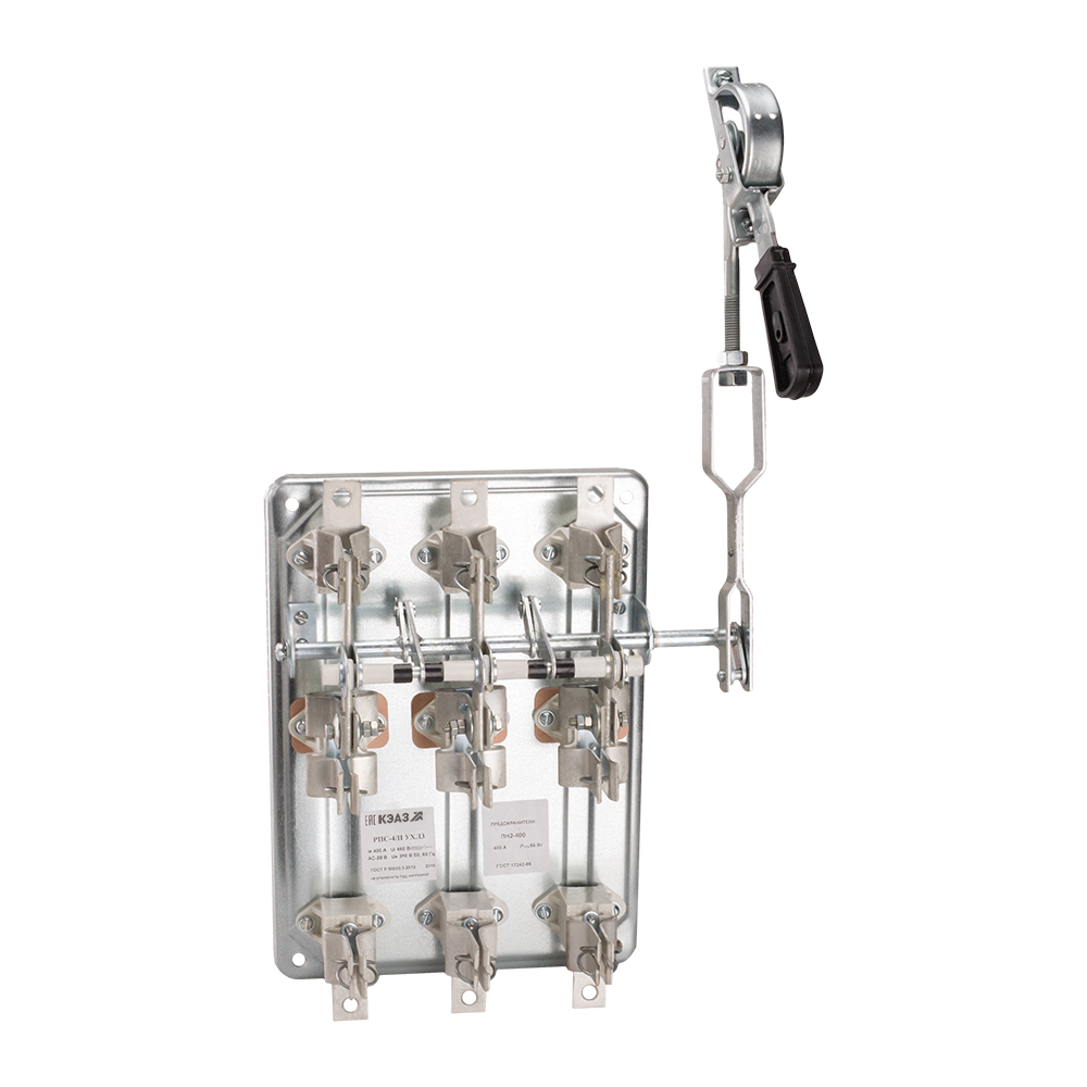 Выключатель-разъединитель 3 полюсный на номинальный ток 400 А, номинальный условный ток короткого замыкания Iq 32 (кА), где установлена передняя смещенная рукоятка, а максимальное сечение присоединяемых медных шин составляет 240 кв. мм.