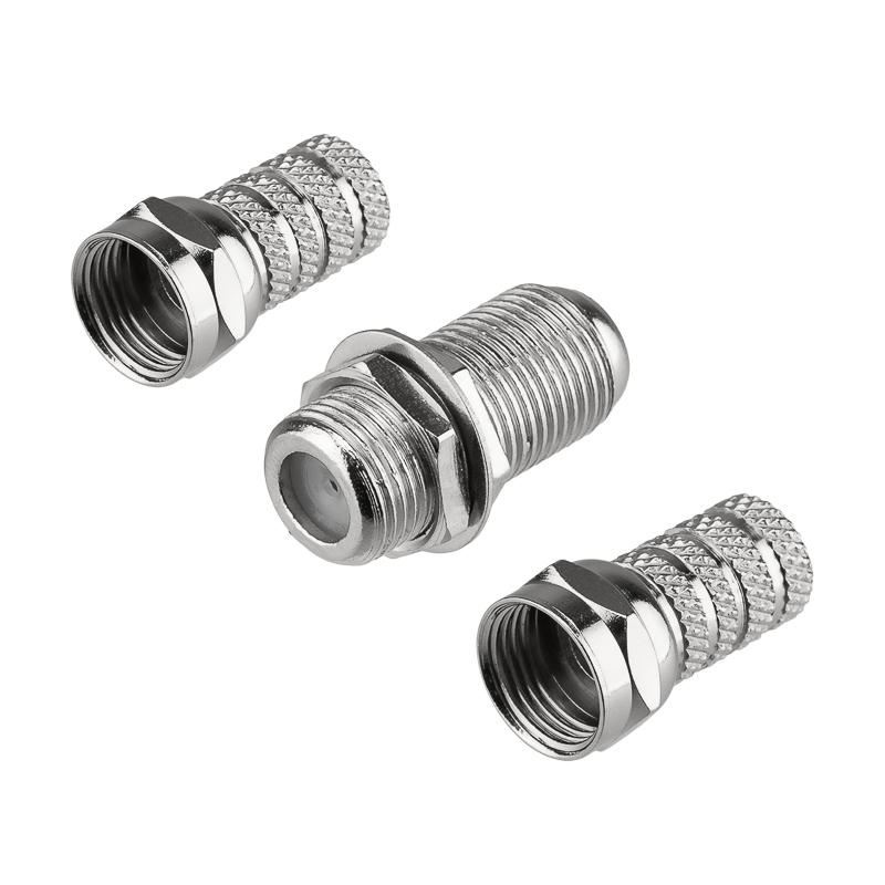 Набор антенныx разъемов №1 предназначен для оконцевания кабелей. В наборе 1 переxодник (гнездо F - гнездо F, бочка с кольцом) и 2 F-разъема RG-6.Разъемы обеспечивают высокую стойкость соединения. Изготовлены из никелированного сплава меди (биметалл).