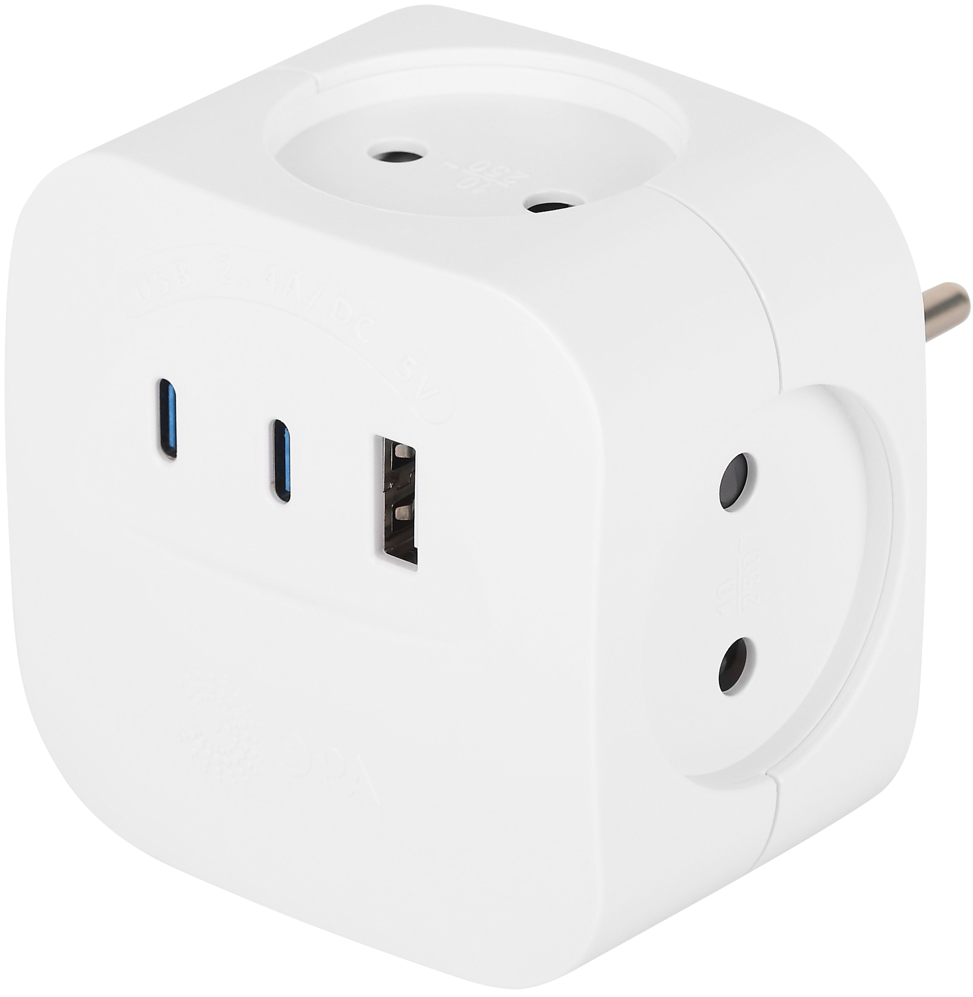 Тройник (адаптер) ЭРА с 4-мя розетками и 3-мя USB A+C гнездами для зарядки портативных устройств. Идеален для зарядки мобильных телефонов и планшетов. Незаменим с собой в дороге. Особенно актуален когда в помещении мало источников подключения - можно из одной розетки сделать четыре и при этом ещё заряжать устройства одновременно через USB. Максимальная мощность USB разъемов: 2400 мА.