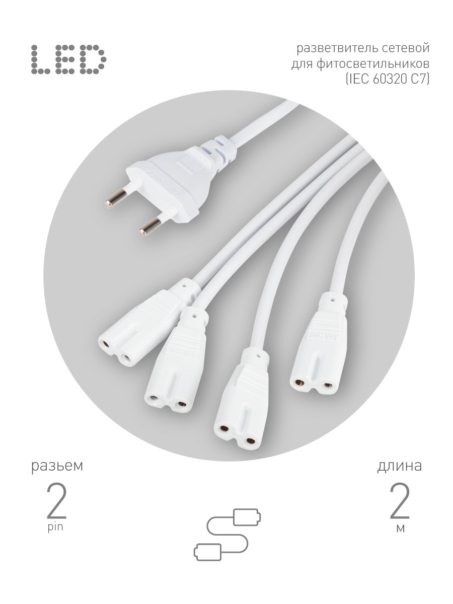 Разветвитель ЭРА FITO 4х IEC C7 (2 pin) для подключения 4 светильников. Практичный продукт для организации досветки растений. Провод изготовлен из качественных материалов, отвечающих высоким требованиям электробезопасности. Фиторазветвитель выполнены по стандарту IEC 60320 C7. Кабель 2х05 мм2, ПВС; для устройств II класса электробезопасности, без заземления. Разветвитель выдерживают нагрузку до 100 Вт.В ассортименте ЭРА представлены разветвители с двойным или тройным штекером питания, а также модели с таймером.