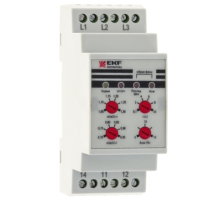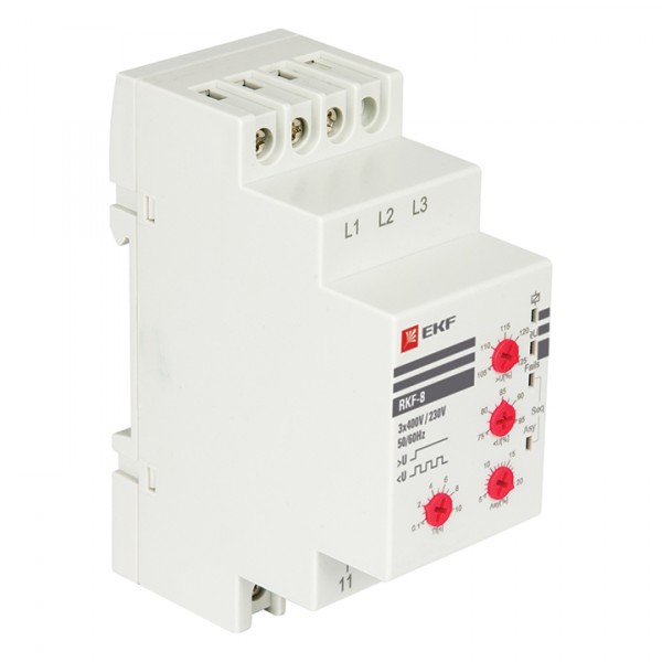 Многофункциональное реле контроля фаз PROxima является устройством, созданным на базе микроконтроллера. Реле применяется в системах автоматизации и предназначено для высокоточного контроля качества питания сети в электроустановках до 1000 В переменного тока трехфазной сети. Реле контролирует следующие параметры: • отсутствие фаз; • падение напряжения (кроме rkf-11, rkf-31); • повышение напряжения (кроме rkf-11, rkf-31); • асимметрия напряжения с выдержкой времени срабатывания (кроме rkf-11, rkf-34, rkf-31); • чередование фаз;