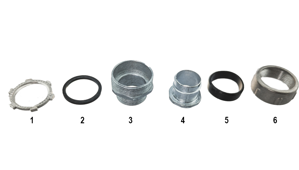 Простота монтажа Дополнительное уплотнение ввода Надежное соединение с металлорукавом и ШЭМ Современный внешний вид Резьбовой крепежный элемент РКН предназначен для герметичного соединения металлорукава типов: МРПИ, МПГ, ШЭМ, РЗ-Ц, РЗ-ЦХ, РЗ-ЦА и других с металлическим корпусом электрооборудования (щиты, шкафы, коробки и др.) в трубных системах электропроводки, с обеспечением надёжного электрического контакта между металлическим корпусом и металлорукавом в соответствии с п. 1.7.77 Правил устройства электроустановок и п.11 ГОСТ Р МЭК 61386.23-2015 Состав комплекта: 1. Заземляющая гайка, 2. Прокладка, 3. Корпус, 4. Оконцеватель, 5. Уплотнитель, 6. Накидная гайка.