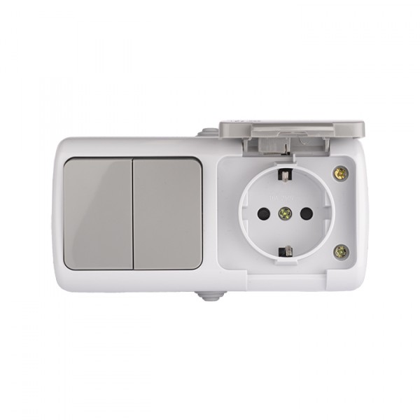 Блок из двухклавишного выключателя и розетки EKF серии Мурманск позволяет организовать электроснабжение в условиях высокой влажности и пыльных помещениях, на улице при условии установки под навесом. Ступенчатые герметичные вводы с двух сторон изделия обеспечивают надежную защиту, позволяя использовать устройство в агрессивных условиях.