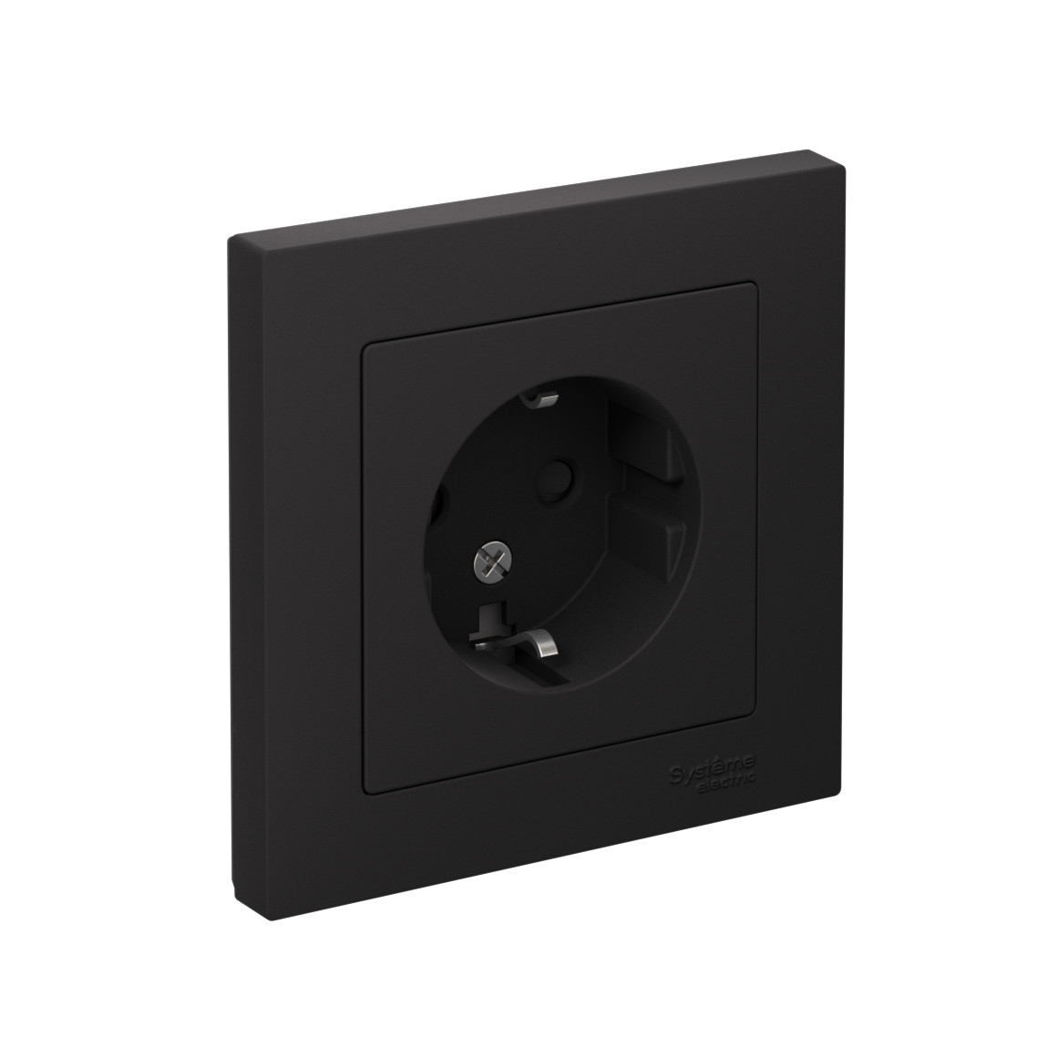 Розетка Systeme Electric (ранее Schneider Electric) серии AtlasDesign (в сборе, цвет карбон) одинарная с заземлением и без шторок подходит для сетей 250 В, на ток 16 А.- Заземляющий контакт обеспечивает дополнительную защиту от удара электрическим током.