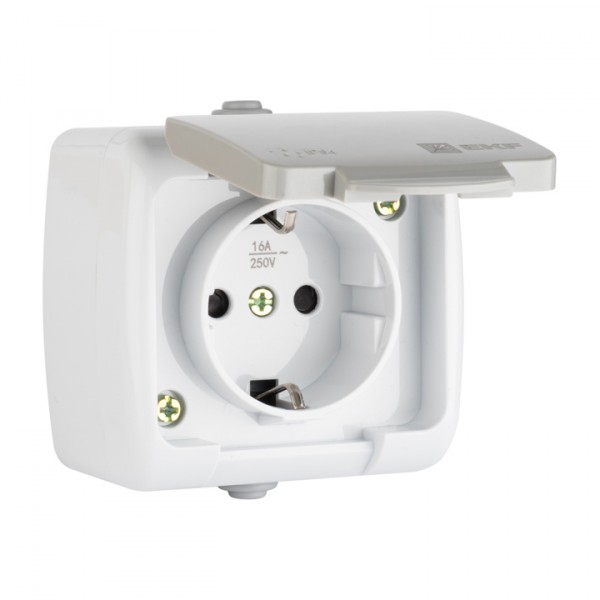 Розетка одноместная EKF серии Мурманск с заземлением, со шторками и крышкой позволяет организовать электроснабжение в условиях высокой влажности и пыльных помещениях, на улице при условии установки под навесом. Ступенчатые герметичные вводы с двух сторон изделия обеспечивают надежную защиту, позволяя использовать устройство в агрессивных условиях.