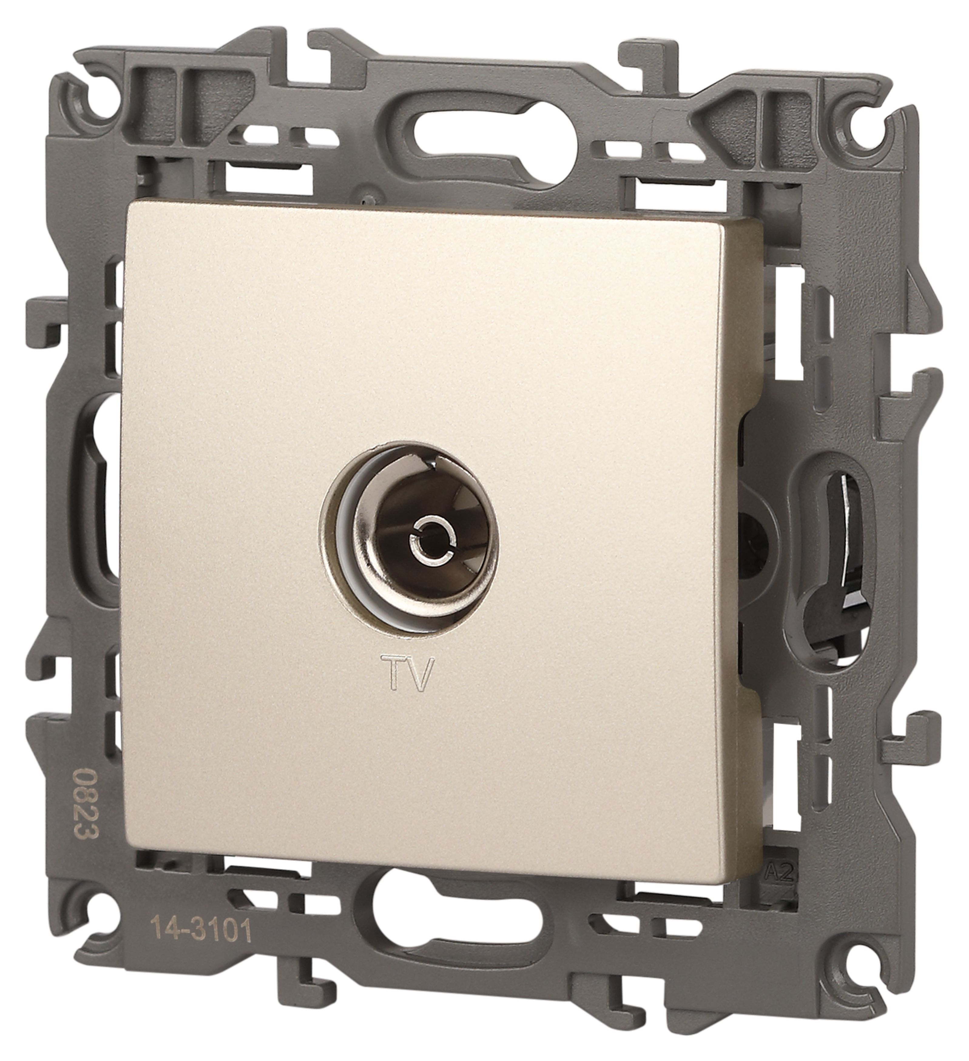 Розетка телевизионная одиночная серии Эра Elegance цвет шампань 14-3101-04. Рамки приобретаются отдельно. Рамки Эра Elegance ПЛАСТИК: 1 пост 14-5001-хх, 2 поста 14-5002-хх, 3 поста 14-5003-хх, 4 поста 14-5004-хх, 5 постов 14-5005-хх; СТЕКЛО: 1 пост 14-5101-хх, 2 поста 14-5102-хх, 3 поста 14-5103-хх, 4 поста 14-5104-хх; МЕТАЛЛ: 1 пост 14-5201-хх, 2 поста 14-5202-хх, 3 поста 14-5203-хх, 4 поста 14-5204-хх; ДЕРЕВО: 1 пост 14-5301-хх, 2 поста 14-5302-хх, 3 поста 14-5303-хх, 4 поста 14-5304-хх (хх - код цвета: 00-прозрачный, 01-белый, белёный дуб, 02-слоновая кость, 03-алюминий, 04-шампань, 05-чёрный, чёрное дерево, 07-ясень, 09-дуб, 10-венге, 11-клён, 14-медь, 21-жёлтый, 22-оранжевый, 23-красный, 25-бордо, 26-лайм, 27-зелёный, 28-голубой, 29-синий, 30-розовый, 31-мокко, 32-серый, 41-сталь, 42-титан).