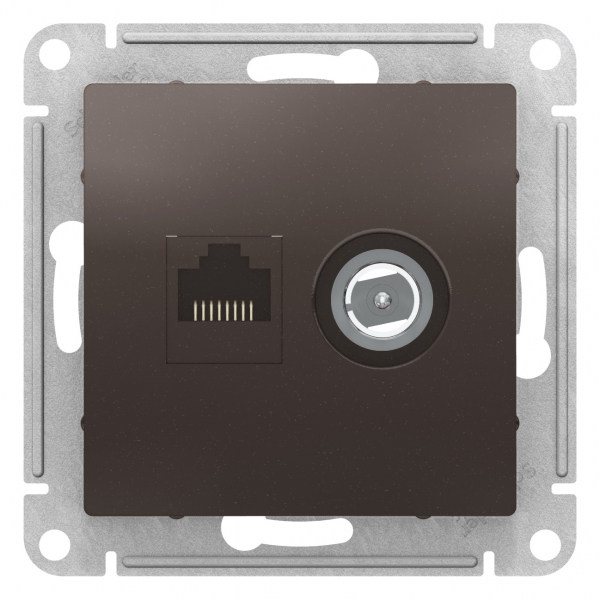 Механизм Systeme Electric (ранее Schneider Electric) серии AtlasDesign в цвете мокко двойной розетки разъёмами RJ45 категории 5е и TV предназначен для удобного и быстрого подключения вашего компьютера и телевизора к соответствующим сетям. Лицевые детали из качественного ABS-пластика, устойчивого к царапинам и УФ-излучению. Усиленные прямые монтажные лапки для лучшей фиксации механизма в монтажной коробке.