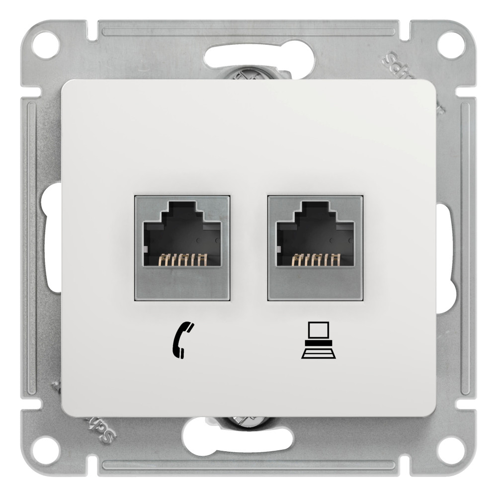 Механизм Systeme Electric (ранее Schneider Electric) серии Glossa (цвет белый) двойной розетки разъёмами RJ45 категория 5е и RJ11 предназначен для удобного и быстрого подключения вашего компьютера и телефона к соответствующим сетям. Выполнен из материала PС+ASA, стойкого к УФ-излучению и появлению царапин.