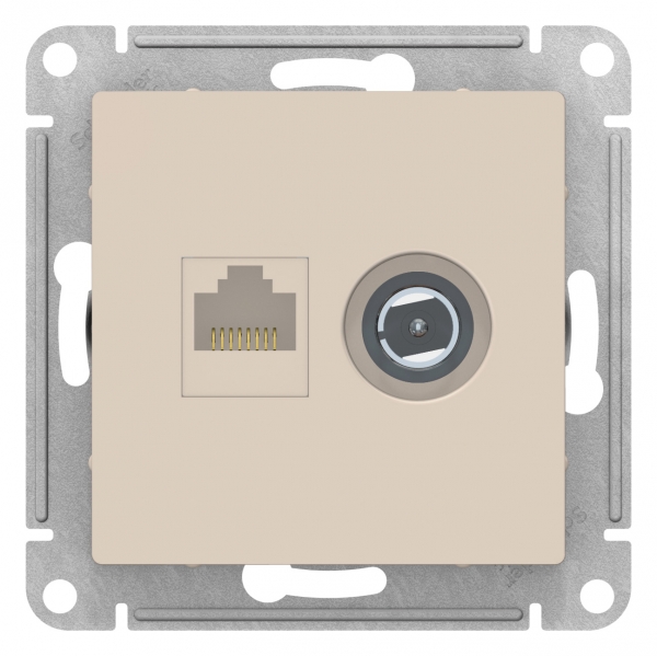 Механизм Systeme Electric (ранее Schneider Electric) серии AtlasDesign в бежевом цвете двойной розетки разъёмами RJ45 категории 5е и TV предназначен для удобного и быстрого подключения вашего компьютера и телевизора к соответствующим сетям. Лицевые детали из качественного ABS-пластика, устойчивого к царапинам и УФ-излучению. Усиленные прямые монтажные лапки для лучшей фиксации механизма в монтажной коробке.
