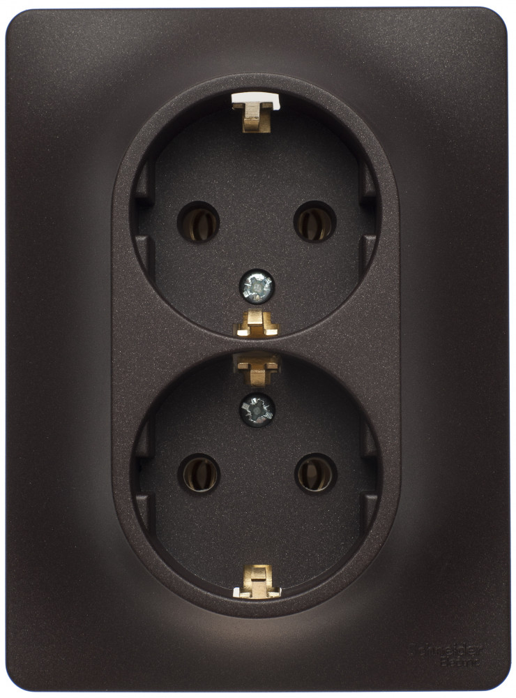 Розетка двойная Systeme Electric (ранее Schneider Electric) серии Glossa (в сборе, цвет шоколад) с заземлением, без шторок подходит для сетей 250 В, на ток 16 А.- Заземляющий контакт обеспечивает дополнительную защиту от удара электрическим током. При наличии заземления электрический потенциал уходит в землю, защищая человека.
