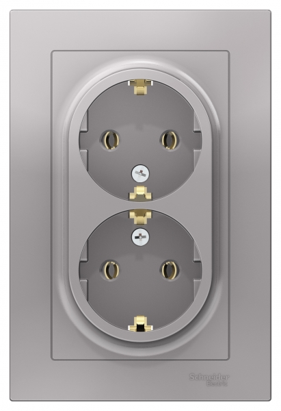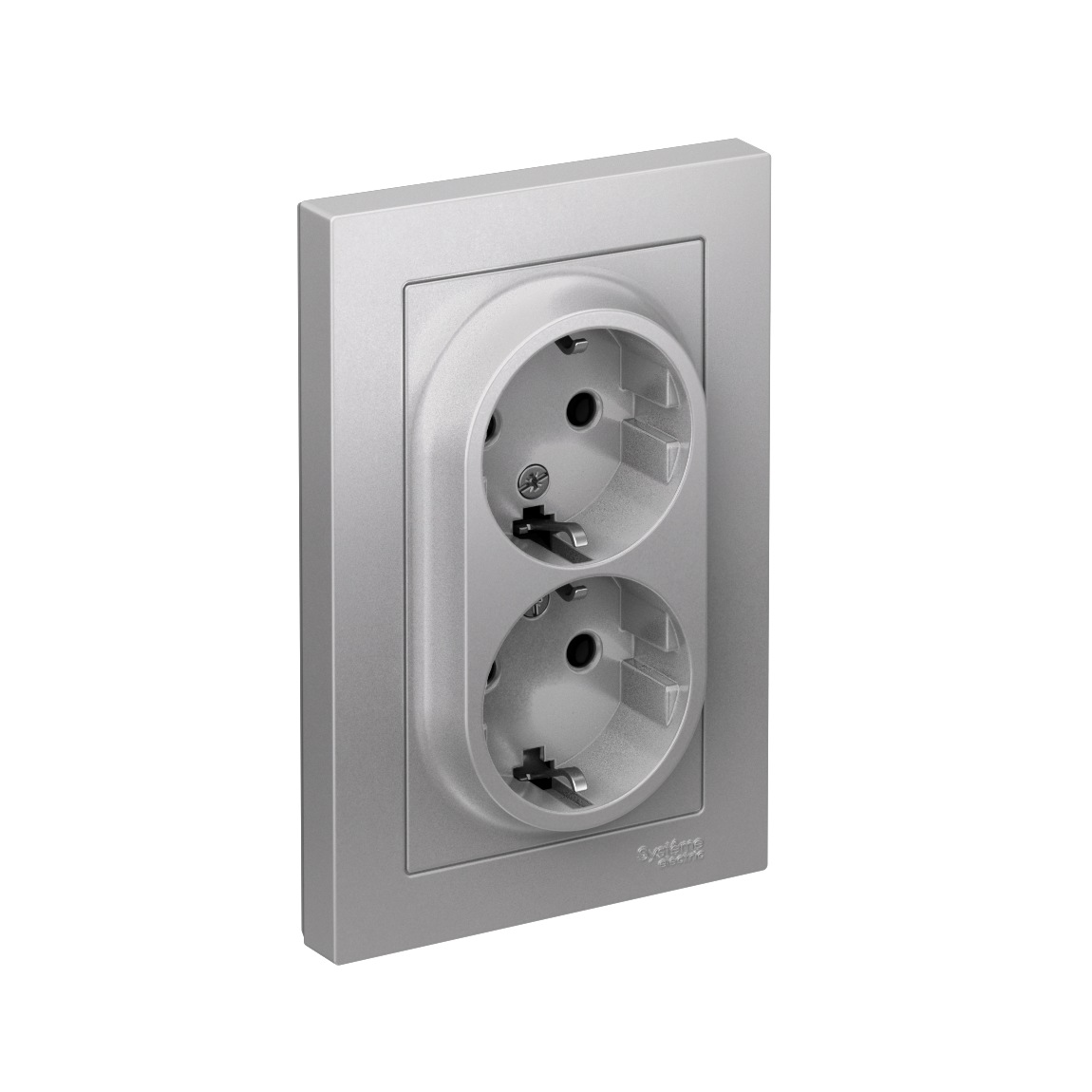 Розетка двойная в сборе Systeme Electric (ранее Schneider Electric) серии AtlasDesign в цвете алюминий с заземлением, без шторок подходит для сетей 250 В, на ток 16 А. Заземляющий контакт обеспечивает дополнительную защиту от удара электрическим током. Лицевые детали из качественного ABS-пластика, устойчивого к царапинам и УФ-излучению. Двойная розетка позволяет подключить два устройства в одном месте. Изделие поставляется в комплекте с рамкой того же цвета.