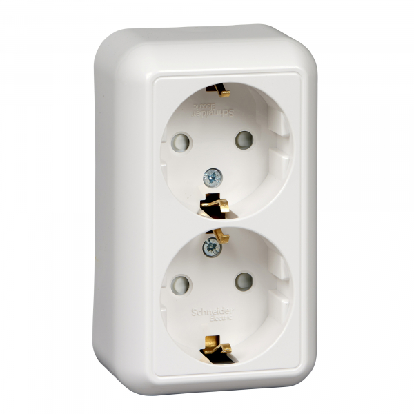 Розетка двойная Schneider Electric ПРИМА (открытой установки, цвет белый) с заземлением и со шторками, с монтажной стальной пластиной предназначена для сетей до 250 В на ток до 16 А.- Двойная розетка позволяет подключить два устройства в одном месте.