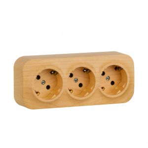 Тройная розетка с заземлением, со шторками Legrand Quteo, цвет дерево, для открытого монтажа. Максимальный ток 16 А, максимальная мощность 3680 Вт. Применяется в зданиях, оборудованных для повышения безопасности проводкой с заземлением (с защитным проводником). Рекомендуются к применению в помещениях в которых могут быть дети. Шторки осуществляют защитную функцию путём ограничения доступа к токоведущим контактам. Доступ открывается только при подключении вилки.Особенности