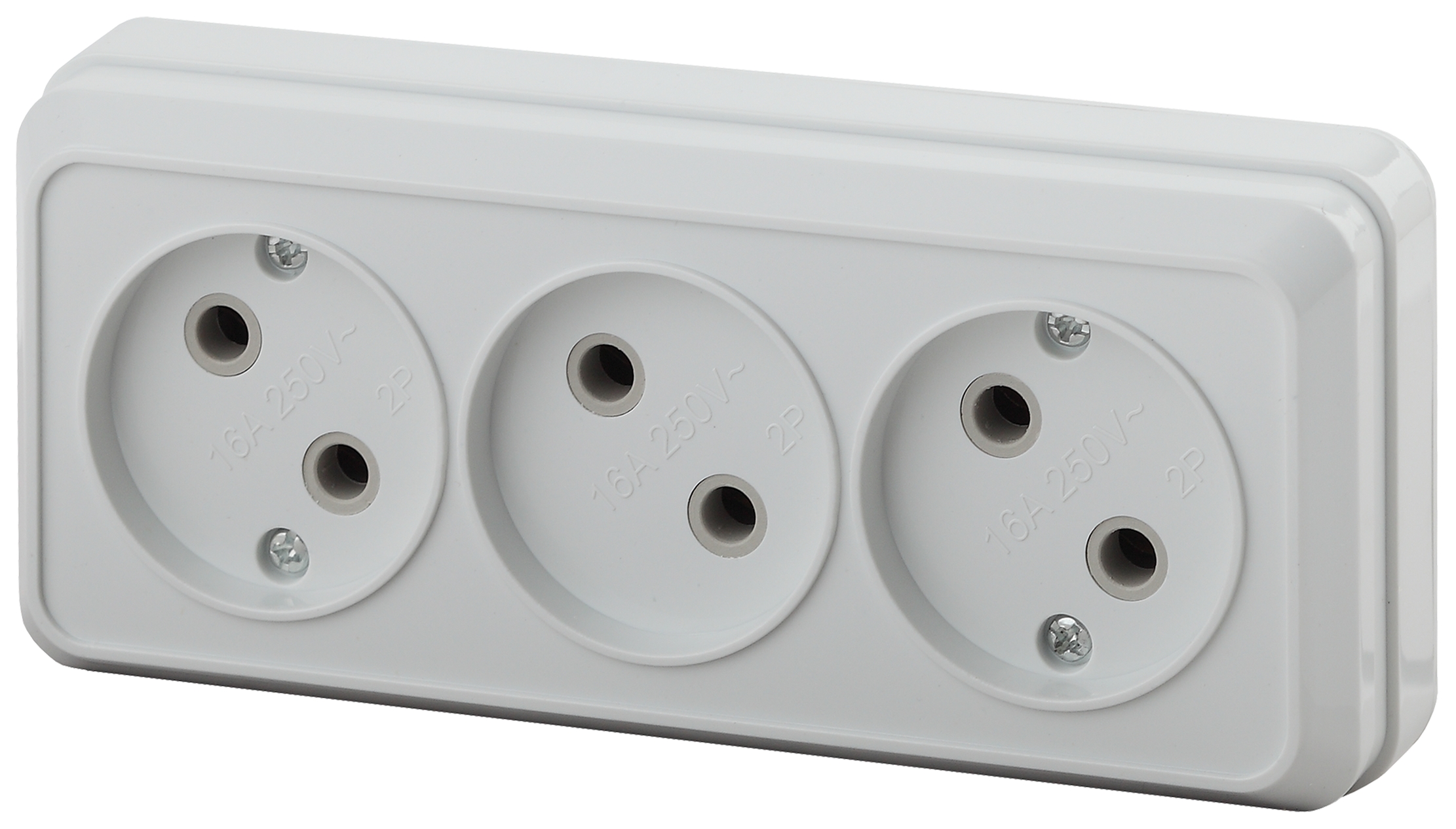 Розетка тройная 3-я серии Intro Quadro открытой установки цвет белый 2-205-01. Номинальные характеристики 16А 250В. Розетка выполнена из термопласта, стали и латуни, оснащёна винтовыми зажимами.