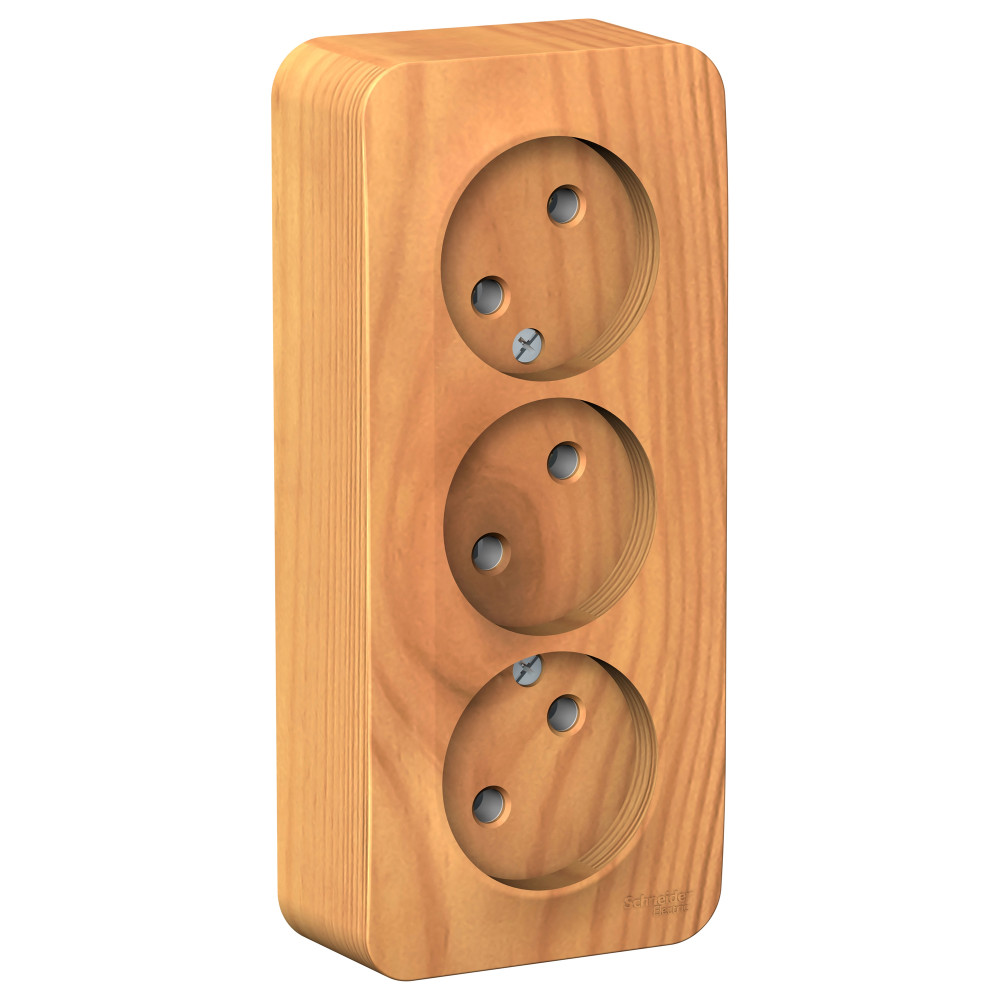 Розетка Systeme Electric (ранее Schneider Electric) BLANCA (ясень, открытой установки) трехместная, без шторок и заземления, с изолирующей пластиной предназначена для сетей до 250В, на ток до 16А. Трехместная розетка позволяет подключить три устройства в одном месте. Изделия цвета Ясень обладают уникальным рисунком, напоминающим древесный сруб. Она изготовлена из ABS-пластика, проста в установке и удобна в применении.