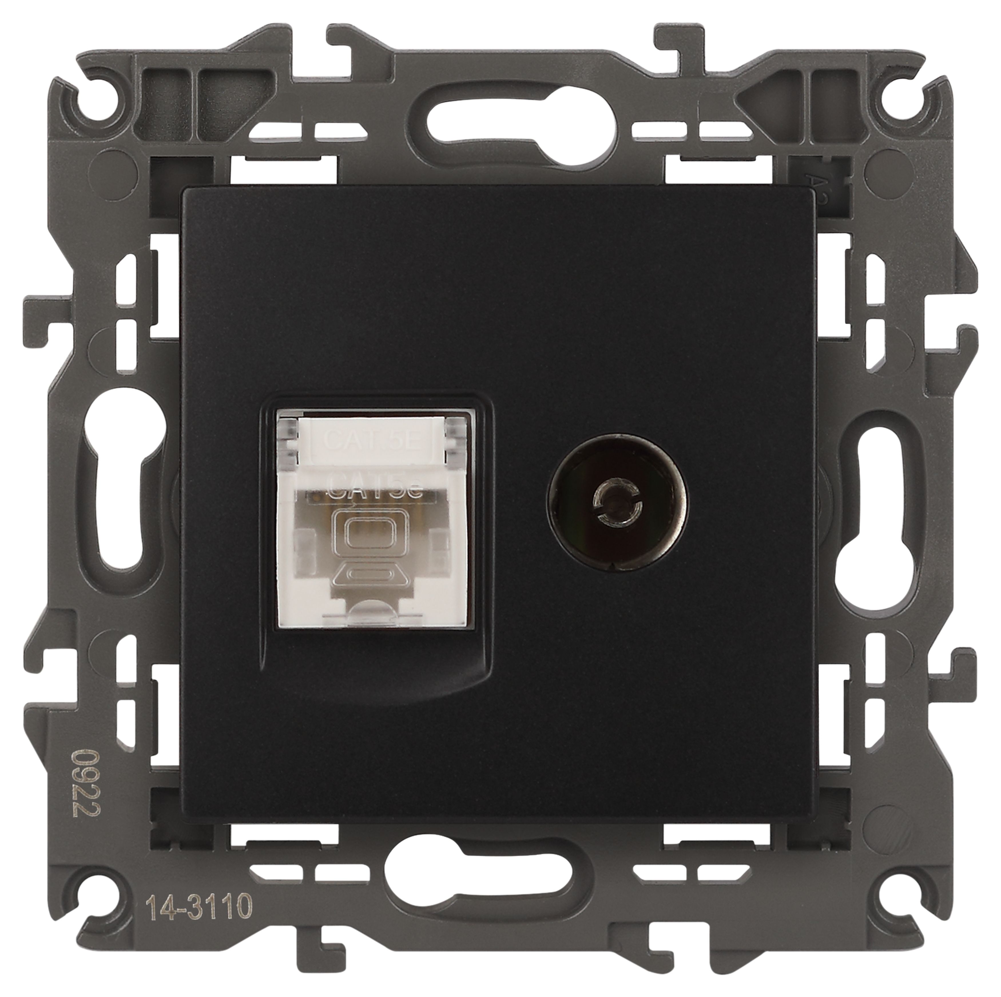 Розетка телевизионная + интернет серии Эра Elegance цвет антрацит 14-3110-05. Рамки приобретаются отдельно. Рамки Эра Elegance ПЛАСТИК: 1 пост 14-5001-хх, 2 поста 14-5002-хх, 3 поста 14-5003-хх, 4 поста 14-5004-хх, 5 постов 14-5005-хх; СТЕКЛО: 1 пост 14-5101-хх, 2 поста 14-5102-хх, 3 поста 14-5103-хх, 4 поста 14-5104-хх; МЕТАЛЛ: 1 пост 14-5201-хх, 2 поста 14-5202-хх, 3 поста 14-5203-хх, 4 поста 14-5204-хх; ДЕРЕВО: 1 пост 14-5301-хх, 2 поста 14-5302-хх, 3 поста 14-5303-хх, 4 поста 14-5304-хх (хх - код цвета: 00-прозрачный, 01-белый, белёный дуб, 02-слоновая кость, 03-алюминий, 04-шампань, 05-чёрный, чёрное дерево, 07-ясень, 09-дуб, 10-венге, 11-клён, 14-медь, 21-жёлтый, 22-оранжевый, 23-красный, 25-бордо, 26-лайм, 27-зелёный, 28-голубой, 29-синий, 30-розовый, 31-мокко, 32-серый, 41-сталь, 42-титан).
