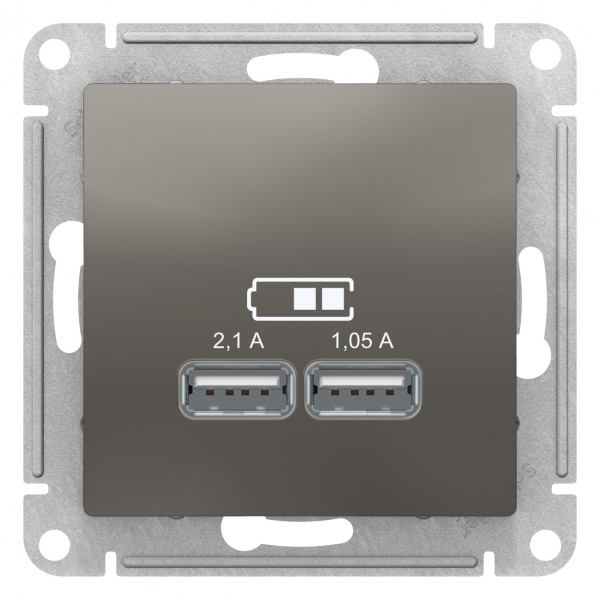 Механизм Systeme Electric (ранее Schneider Electric) серии AtlasDesign в цвете сталь розетки для зарядки с двумя разъёмами USB, с выходным напряжением 5 В постоянного тока и выходами с номинальным током по 2,1 А. USB розетка позволяет напрямую заряжать одно или два мобильных устройства. Лицевые детали из качественного ABS-пластика, устойчивого к царапинам и УФ-излучению. Усиленные прямые монтажные лапки для лучшей фиксации механизма в монтажной коробке.