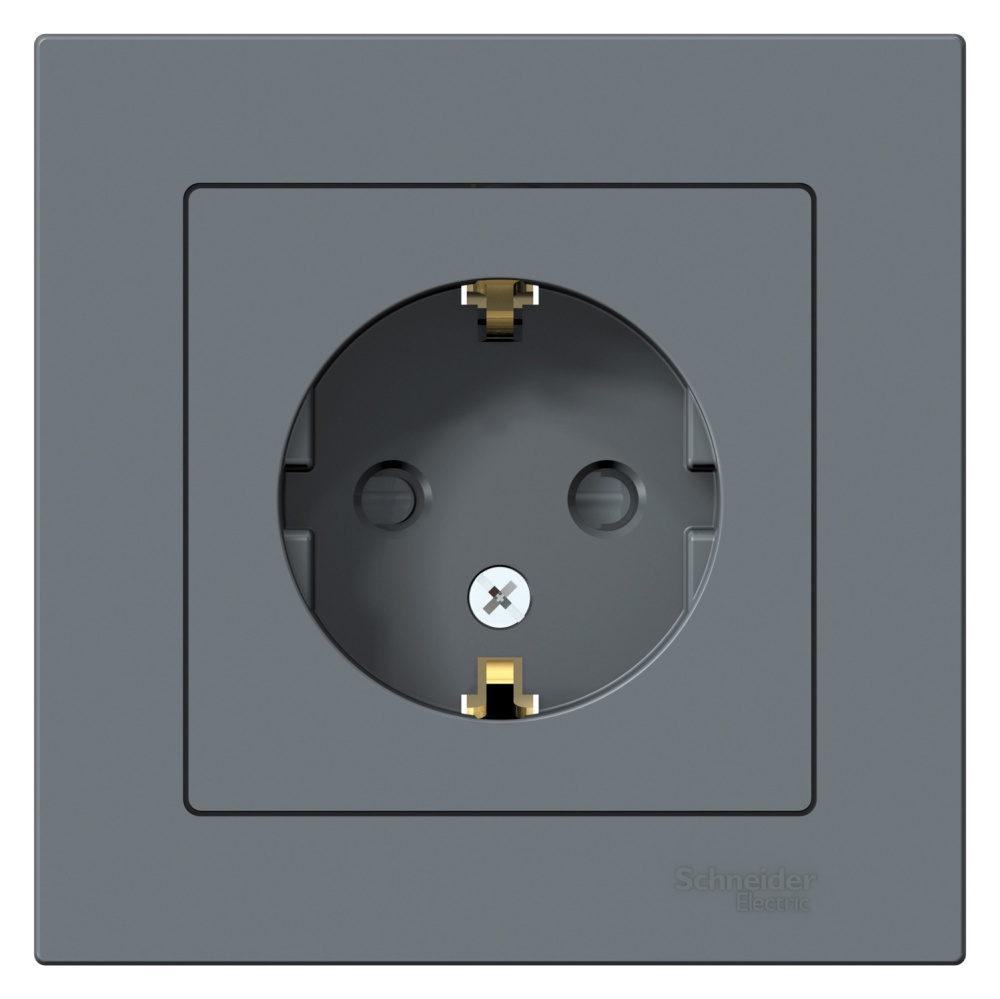 Розетка в сборе Systeme Electric (ранее Schneider Electric) серии AtlasDesign в цвете грифель одинарная с заземлением и без шторок подходит для сетей 250 В, на ток 16 А. Заземляющий контакт обеспечивает дополнительную защиту от удара электрическим током. При наличии заземления электрический потенциал уходит в землю, защищая человека. Лицевые детали из качественного ABS-пластика, устойчивого к царапинам и УФ-излучению. Изделие поставляется в комплекте с рамкой того же цвета.