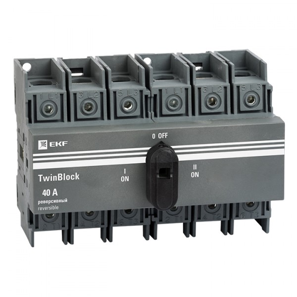 Рубильники серии TwinBlock предназначены для пропускания номинальных токов, включения и отключения электрических цепей номинальным напряжением до 690 В переменного тока частотой 50 и 60 Гц в устройствах распределения электрической энергии. Выключатели-разъединители серии TwinBlock (модели 40-800 А) имеют возможность подключения дополнительного четвертого полюса. Реверсивные рубильники серии TwinBlock предназначены для переключения нагрузки на резервную линию с разрывом питания (индикация положений на рубильнике I-0-II). Электрические характеристики реверсивных рубильников серии TwinBlock позволяют выполнять переключение под нагрузкой между двумя источниками питания, даже при токах с высокой индуктивной составляющей и пусковых токах двигателей.