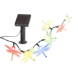 Садовая гирлянда из 20 полупрозрачных стрекоз, длина 5,5 метра. Разноцветные светодиоды: красный, желтый, синий, зелёный.