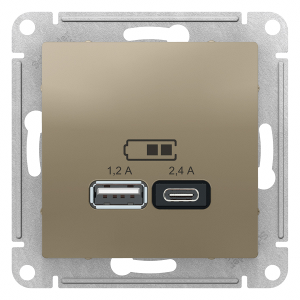 Розетка Systeme Electric (ранее Schneider Electric) серии AtlasDesign в цвете шампань двойная USB с разъемами типа A+C. Лицевые детали из качественного ABS-пластика, устойчивого к царапинам и УФ-излучению. Самая современная USB-зарядка с двумя разъемами позволяет заряжать как стандартные мобильные устройства через разъем типа А, так и новейшие устройства, в том числе ноутбуки, с разъемом типа С.