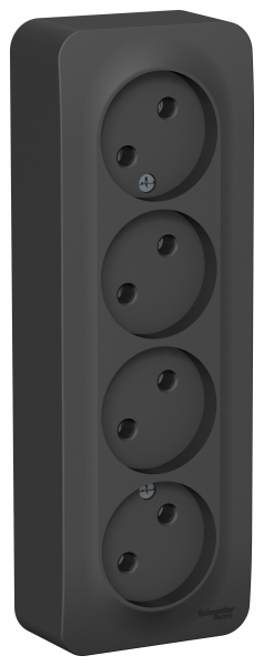 Розетка Systeme Electric (ранее Schneider Electric) BLANCA (антрацит, открытой установки) четырехместная, без шторок и заземления, с изолирующей пластиной предназначена для сетей до 250В, на ток до 16А. четырехместная розетка позволяет подключить четыре устройства в одном месте. Она изготовлена из ABS-пластика, проста в установке и удобна в применении.