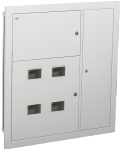 Используется для сборки этажного распределительного щита на 4 квартиры, предназначенного для приема и распределения электроэнергии в жилых и общественных зданиях, а также для защиты отходящих линий при перегрузках и коротких замыканиях.Сварной металлический корпус состоит из трех отсеков: вводно-учетного, распределительного, отсека слаботочного оборудования. В вводно-учетном и распределительном отсеках размещены DIN-рейки для крепления счетчиков (по количеству квартир). В распределительном отсеке установлены DIN-рейки для аппаратов групповых линий и рейка для установки шин N и РЕ. Отсек укомплектован оперативной панелью. Отсек слаботочного оборудования снабжен перфорированными профилями для прокладки теле- и радиосетей, телефонных линий, сетей охранной сигнализации, домофонов и т.п. Для обеспечения пожарной безопасности между слаботочным и силовым отсеками расположена разделительная перегородка.