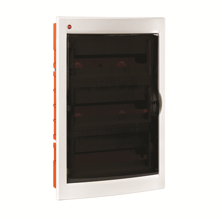Встраиваемый распределительный щиток ДКС предназначен для монтажа в жилых и административных помещениях для установки автоматических выключателей любых производителей: таймеров, устройств защитного отключения и управления освещением и т.д. Щиток имеет оцинкованную DIN-рейку и суппорт, заглушки для пустых модулей, сборочные винты и заглушки для них, самоклеящуюся этикетку для маркировки цепей. Межосевое расстояние между рядами 150-175-200 мм. Преперфорированные отверстия и насечки на задней стенке обеспечивают точное соединение с пластиковыми трубами и обеспечивают легкий монтаж. Дверца выполнена из затемненного полупрозрачного пластика. Специальная конструкция петель дает возможность открывать дверцу более чем на 180°. Степень пыле- и влагозащиты IP 41. Количество модулей - 54. Параметры щитка: ширина - 455 мм, высота - 650 мм, глубина встраиваемой части - 97 мм. Материал - термостойкий пластик. Цвет - белый.