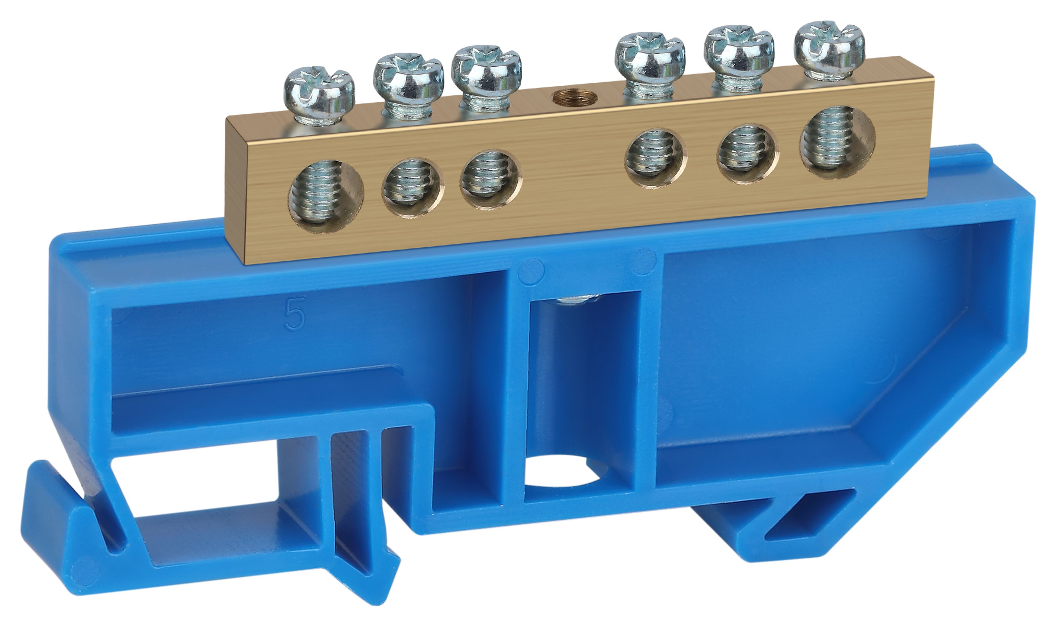 Шины латунные N «нейтраль» 8×12 на DIN-изоляторе применяются для электрического и механического соединения нулевых, защитных и фазных проводников в электрических щитах и распределительных устройствах. Изделия выполняются из латуни соответствующего сечения с отверстиями, обладающими винтовыми зажимами для подключения проводников. Шины установлены на пластиковый изолятор, изготовленный из полипропилена с добавлением антипиренов. Конструкция изолятора обладает креплением для установки на DIN-рейку. Цвет изолятора (синий/жёлтый) позволяет быстро и правильно идентифицировать тип подключаемого проводника.Применение «нулевых» шин позволяет: