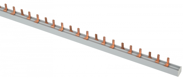 Шины соединительные производятся в двух исполнениях: FORK (вилка) и PIN (гребенка) на номинальные токи 63 и 100 А, на одно-, двух-,трех- и четырехфазную нагрузку. Шины соединительные представляют собой пластины, выполненные из меди (шины на 100 А из луженой меди), закрепленные в корпусе из диэлектрического материала, не поддерживающего горение, и выпускаются стандартной длиной 1 метр.