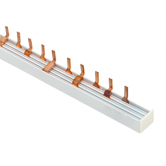 Шины соединительные представляют собой пластины, выполненные из меди (шины на 100 А – из луженой меди), закрепленные в корпусе из диэлектрического материала, не поддерживающего горение, и выпускаются стандартной длиной 1 метр. Шины соединительные делятся на два типа - FORK («вилка») и PIN («гребенка») на номинальные токи 63 и 100 А. Могут быть выполнены в одно- двух- трех- и четырехполюсном исполнений.
