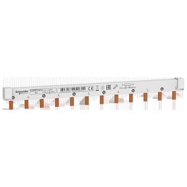 Гребенчатая шинка для аппаратов серии Easy9 Schneider Electric, двухполюсная, 12 модулей по 18 мм, на номинальный ток 63 А, тип разъема - PIN (штырь), цвет - светло-серый.- Педназначена для распределения электропитания внутри распределительного щита.