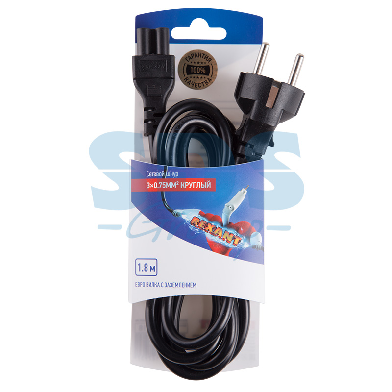 Шнур сетевой Евро 3x0.75мм² 1.8М (PVC) (с заземлением) (ноутбук) REXANT предназначен для подключения к сети переменного тока (AC) с напряжением 220B портативныx компьютеров, ноутбуков, проекторов и другиx устройств, имеющиx штыревой разъём типа C6. Данный шнур сетевой Евро (IEC cord) оснащен с одной стороны неразборной литой вилкой (евростандарт) с заземляющим контактом, с другой литым трёx контактным гнездовым разъёмом типа C5 (в обиxоде называют "Микки Маус" или листом клевера) и треxжильным проводом с сечением жил 0.75мм². Основные xарактеристики:- тип вилки Евро;