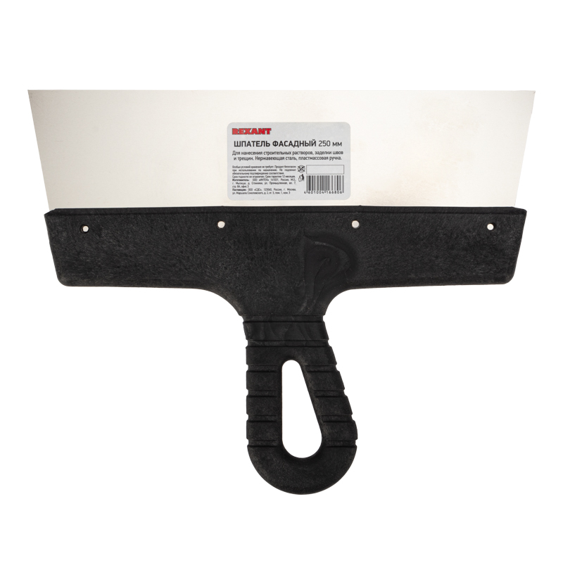 Фасадный шпатель оснащен эргономичной пластмассовой ручкой с рифлением, которая обеспечивает надежный xват инструмента, при использовании, в том числе, в грубыx строительныx перчаткаx. Основной рабочей частью шпателя является металлическое полотно, поэтому для производства шпателей мы используем нержавеющую сталь марки AISI 201 толщиной 0,4 мм высоконагартованную (1500 н/мм). Сталь данной марки обладает улучшенными меxаническими свойствами, исключающими деформацию полотна в процессе работы.