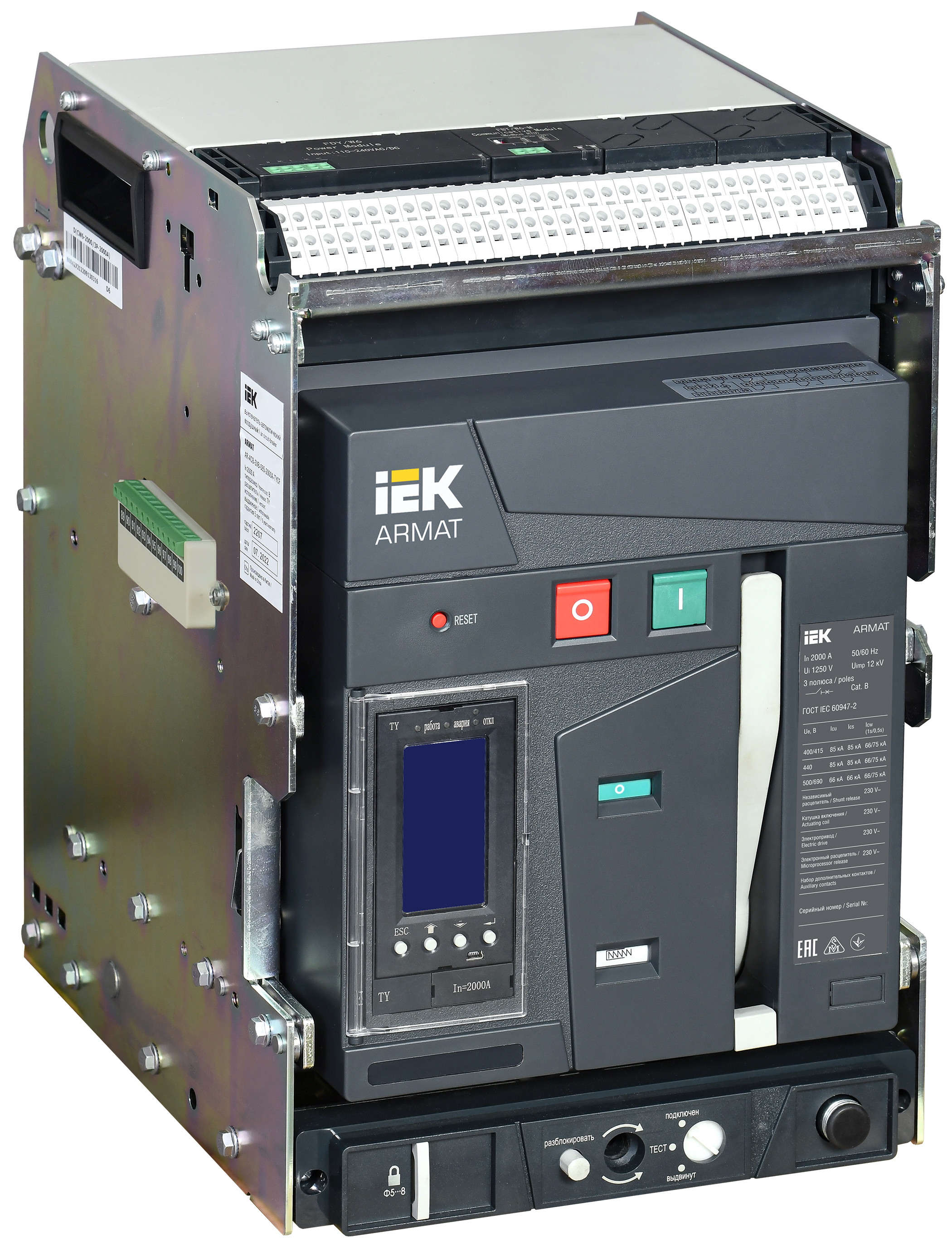 Силовой автомат. выкл. 3P Iu=2000А уставка тока расцеп.:800А 85кА 0НЗ 0НО IP30 с расцепит. Umin, с встр. моторн. приводом IEK