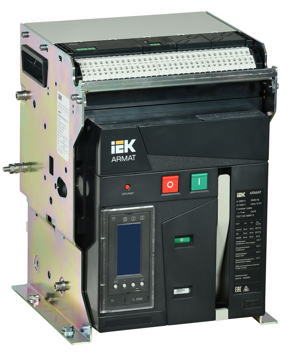 Силовой автомат. выкл. 3P Iu=2000А уставка тока расцеп.:800А 85кА 0НЗ 0НО IP30 с расцепит. Umin, с встр. моторн. приводом IEK