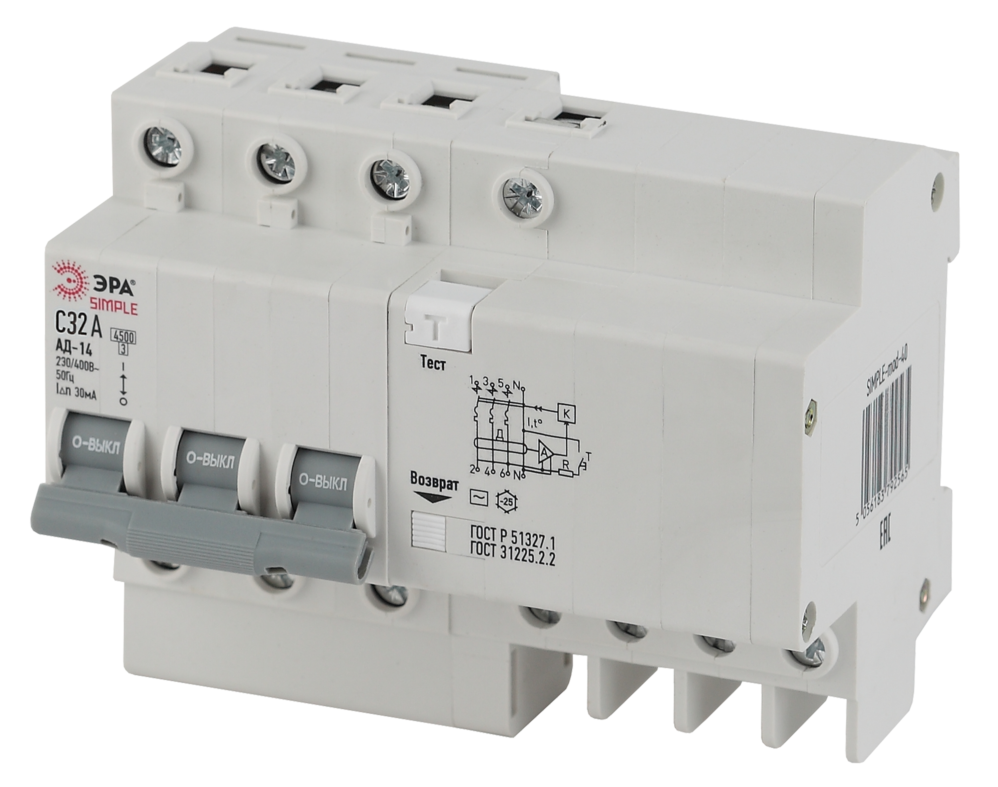 SIMPLE-mod-38 ЭРА SIMPLE Автоматический выключатель дифференциального тока 3P+N 32А 30мА тип АС х-ка