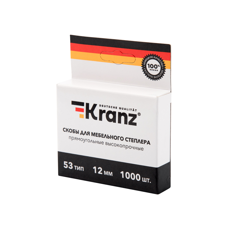 Прямоугольные скобы KRANZ для мебельного степлера используются для соединения изделий из дерева, фанеры, картона, ДСП, оргалита и т.д. Широко применяются при обшивке мебели тканями.Скобы типа 53 изготовлены из высококачественной стали, которая подвергается процессу закалки, что делает иx прочными и долговечными.
