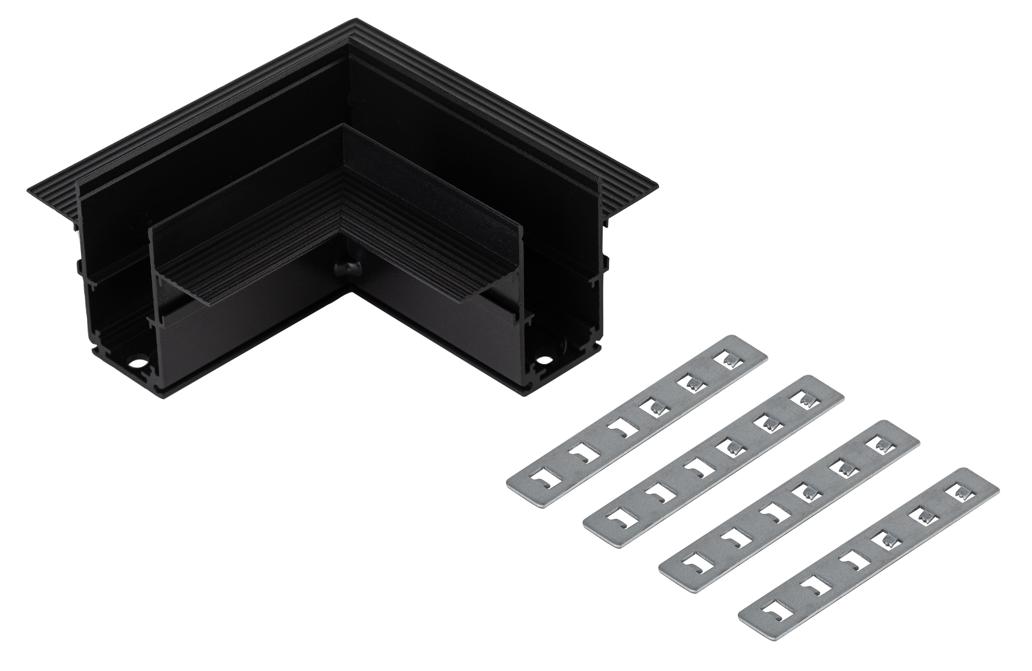 Угловой коннектор для встраиваемого магнитного шинопровода под ГКЛ 12,5 мм NOVA TRM-R20.12-CC BK. Материал - Алюминий. Коннектор предназначен для механического соединения двух отрезков шинопровода TRM-R20.12 под прямым углом на плоскости.