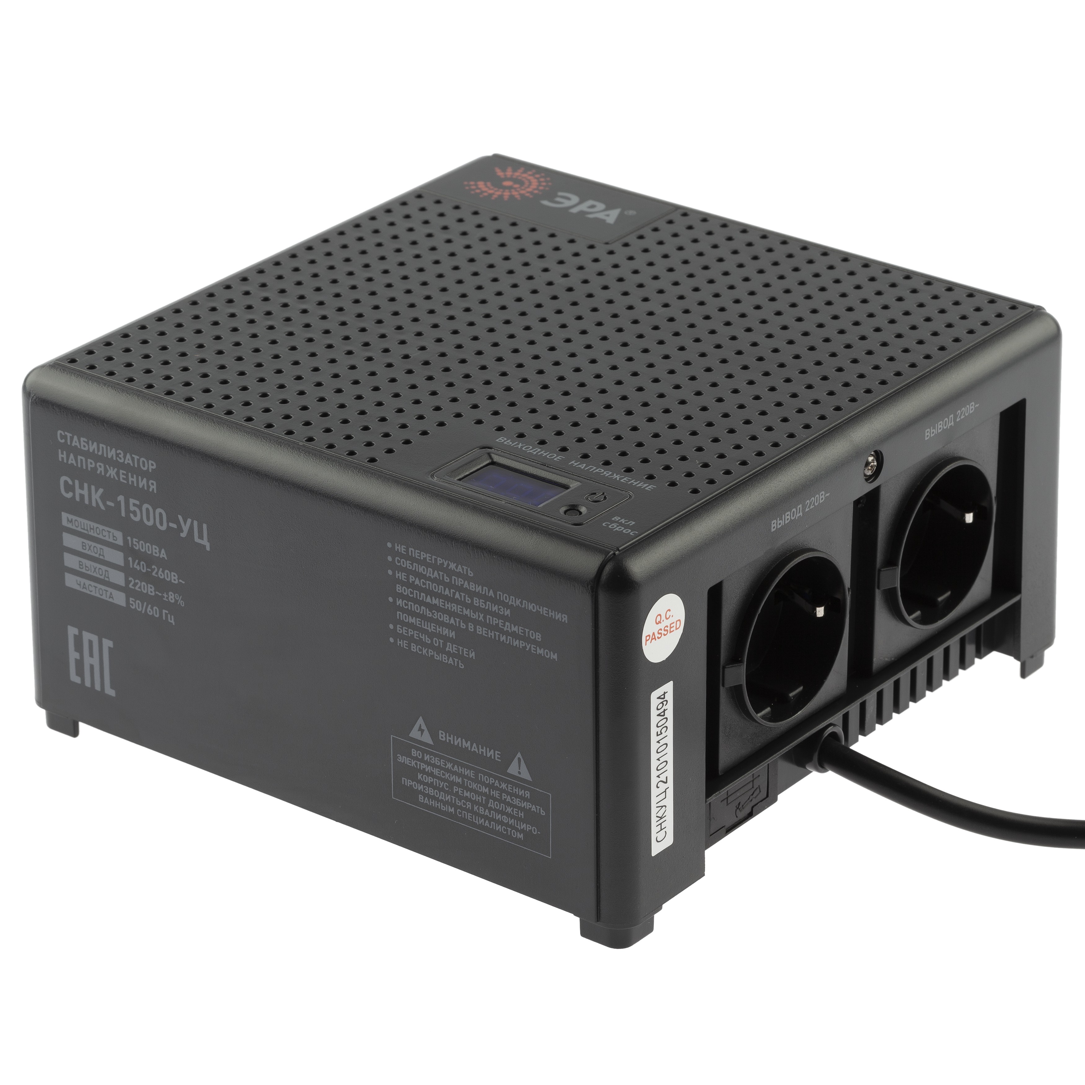 Стабилизатор напряжения компактный однофазный релейный цвет чёрный модели CНК-1500-УЦ. Номинальные характеристики (полная мощность / диапазон входного напряжения): 1500ВА 140-260В . Предназначен для поддержания стабильного однофазного напряжения питания бытовых приборов при отклонениях значений сетевого напряжения. Выбирая стабилизатор, нужно знать, какое электрооборудование будет к нему подключено: один прибор, группу приборов (наиболее чувствительных к перепадам напряжения в сети) либо вся домашняя (офисная) техника. Затем необходимо рассчитать суммарную мощность защищаемых электропотребителей. Основное условие выбора мощности стабилизатора напряжения - суммарная мощность подключаемой к нему нагрузки не должна превышать полной мощности самого стабилизатора (в противном случае автоматика стабилизатора будет их просто отключать). Точные значения мощности можно узнать из паспортных данных Вашего конкретного потребителя. Стабилизатор подбирается с запасом в 25-30% к его полной мощности.