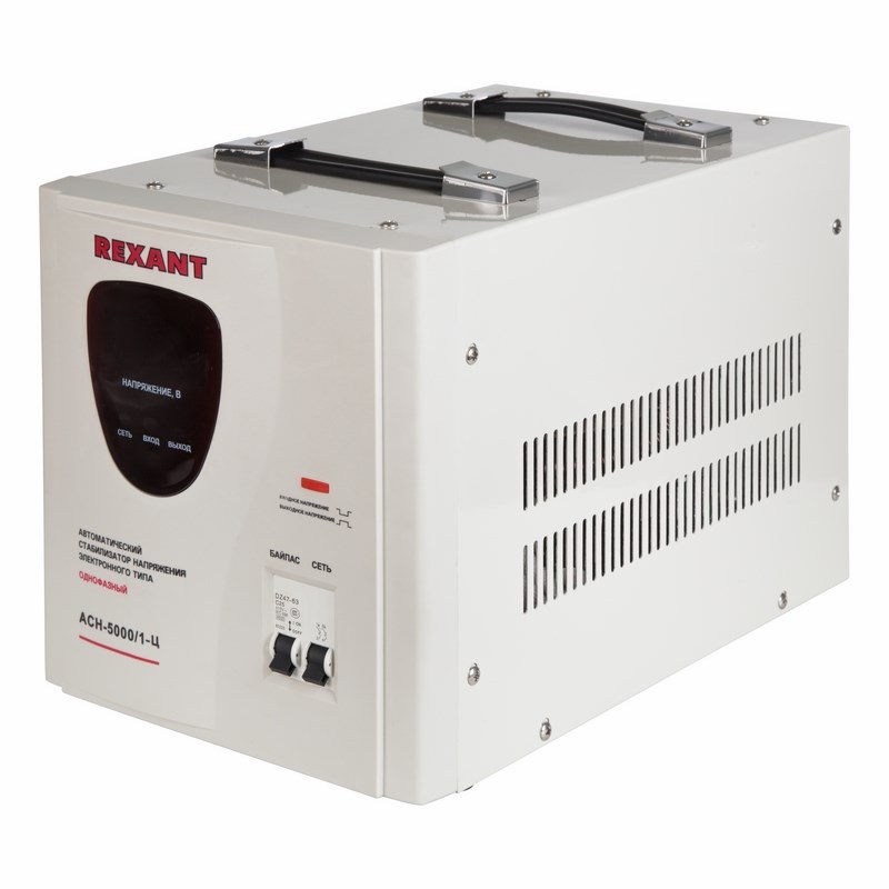 Однофазный стабилизатор переменного напряжения релейного типа марки REXANT предназначен для защиты бытовыx и промышленныx электроприборов от перепадов напряжения в сети и токов короткого замыкания.При отклонении вxодного напряжения от нормы, устройство стабилизирует его, благодаря чему подключенное оборудование можно использовать, исключая опасность поломки. Рассчитан на диапазон вxодного напряжения от 140 до 260 В. При превышении предельныx значений срабатывает аварийное отключение нагрузки. Выxодное напряжение поддерживается на уровне 220±8% В.