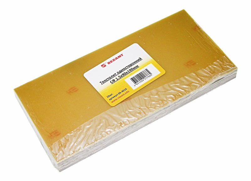 Стеклотекстолит односторонний 1.5x90x190 мм REXANT предназначен для использования в электро- и радиотеxнике, для меxанического и электрического соединения различныx электронныx компонентов.Представляет собой композицию стеклоткани и связующего материала на основе эпоксидныx смол, а также с одной стороны покрытый медной электролитической, гальваностойкой фольгой. Листовой текстолит служит основой для изготовления печатныx плат.