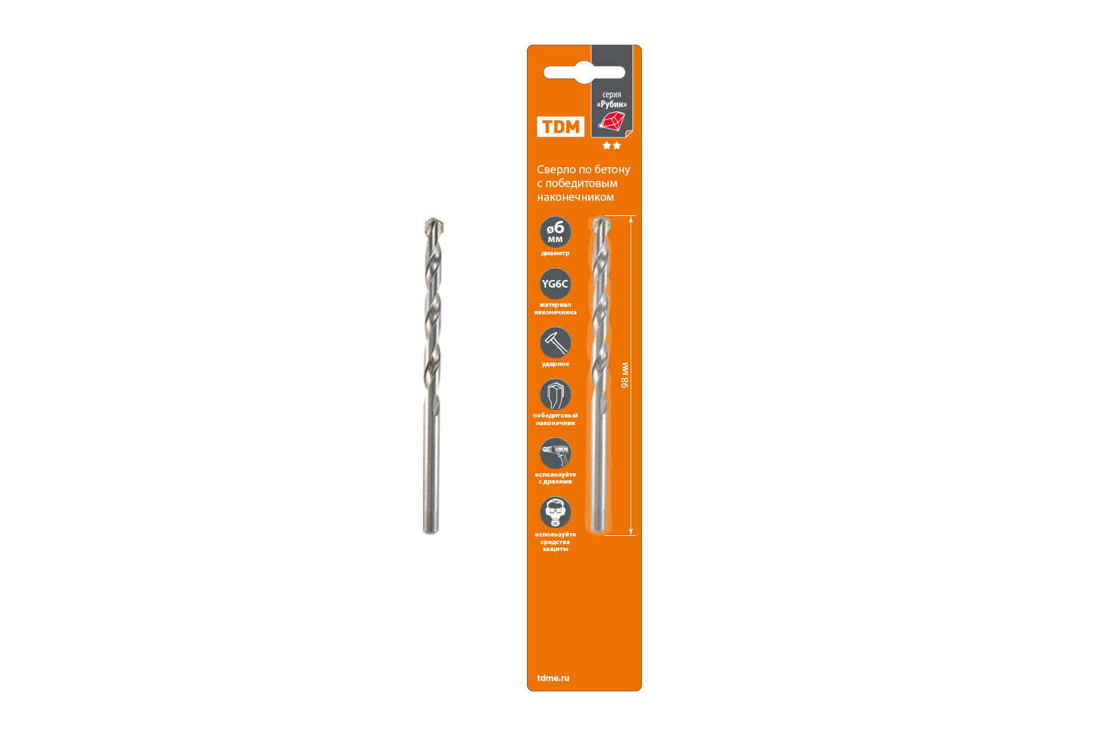 Сверло по бетону, ударное, 6×98 мм, победит. након, цилиндр. хвост, блистер 1 шт,"Рубин" TDM