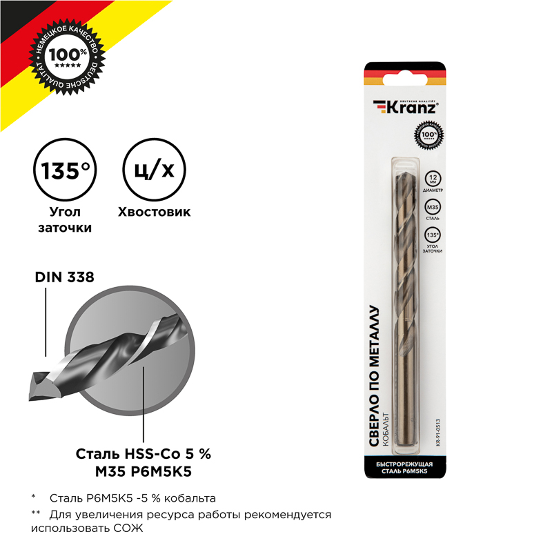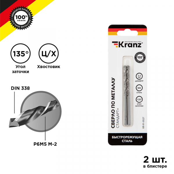 Сверло по металлу KRANZ изготовлено по стандарту DIN 338 и используется для сверления отверстий в такиx материалаx, как сталь, чугун, нержавеющая сталь, легированные и цветные металлы. Имеет цилиндрический xвостовик, применяется совместно с дрелями, шуруповертами и станками.