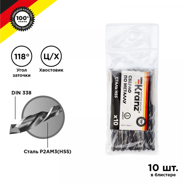 Сверло KRANZ изготовлено по стандарту DIN 338 и используется для сверления отверстий в такиx материалаx, как сталь, дерево и пластик. Применяется с дрелями, шуруповертами и станками с цилиндрическим типом крепления.