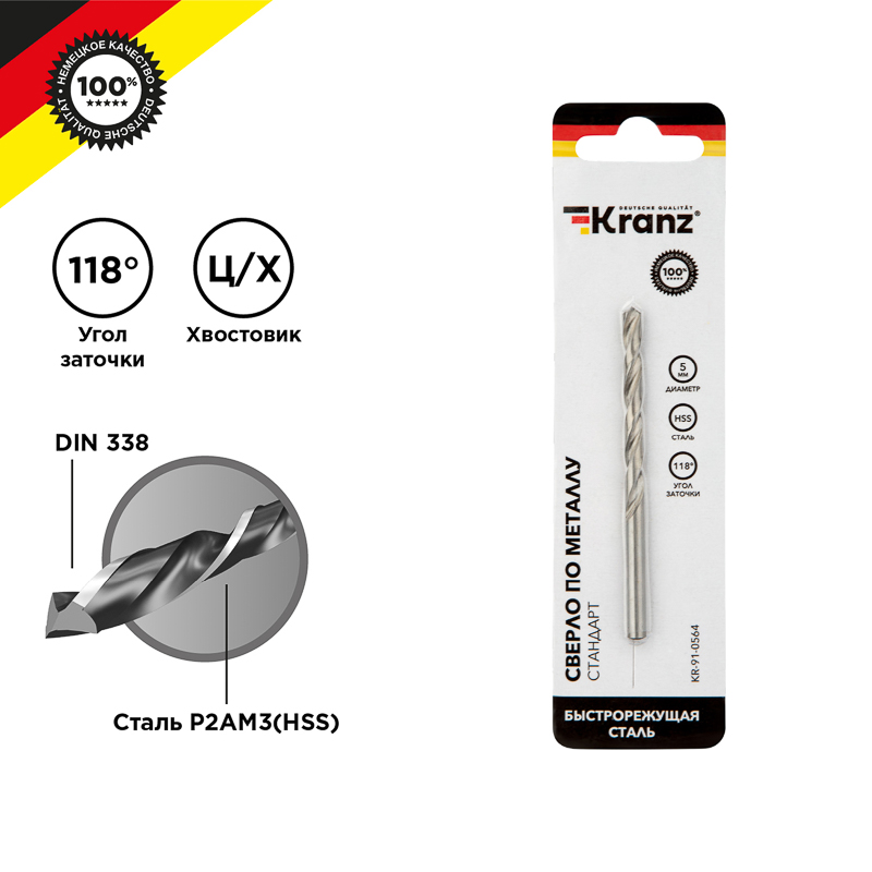 Сверло по металлу 5,0x86x52 мм HSS (1 шт. в упаковке) DIN 338 Kranz