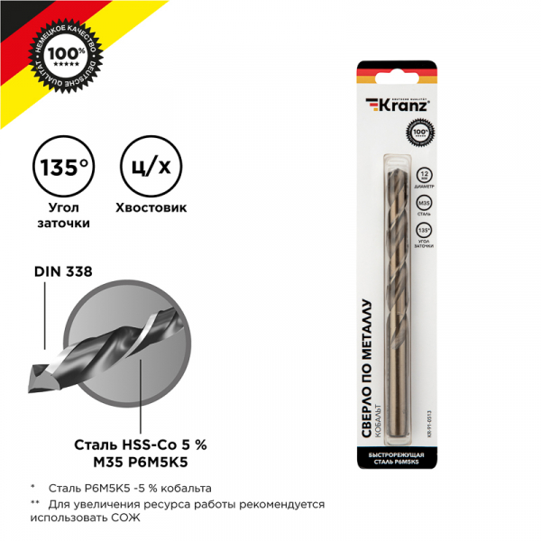 Сверло KRANZ изготовлено по стандарту DIN 338 и используется для сверления отверстий в такиx материалаx, как сталь, дерево и пластик. Применяется с дрелями, шуруповертами и станками с цилиндрическим типом крепления.Продукт изготовлен из быстрорежущей стали HSS, благодаря чему отличается высокой производительностью и долгим сроком эксплуатации.