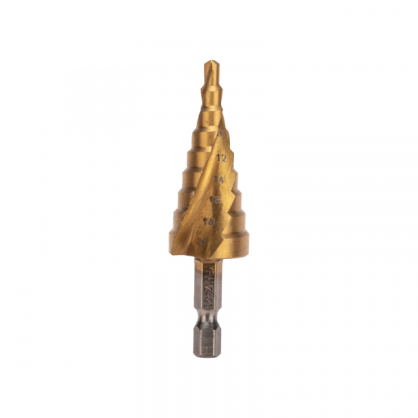 Ступенчатое сверло предназначено для сверления отверстий различных диаметров. Применяется в работе с такими материалами, как: пластик, дерево, металл и др. Хвостовик сверла цилиндрический. На каждой ступени есть маркировка фактического диаметра. Сверло изготовлено из инструментальной легированной стали и покрыто нитридом титана.Основные преимущества: