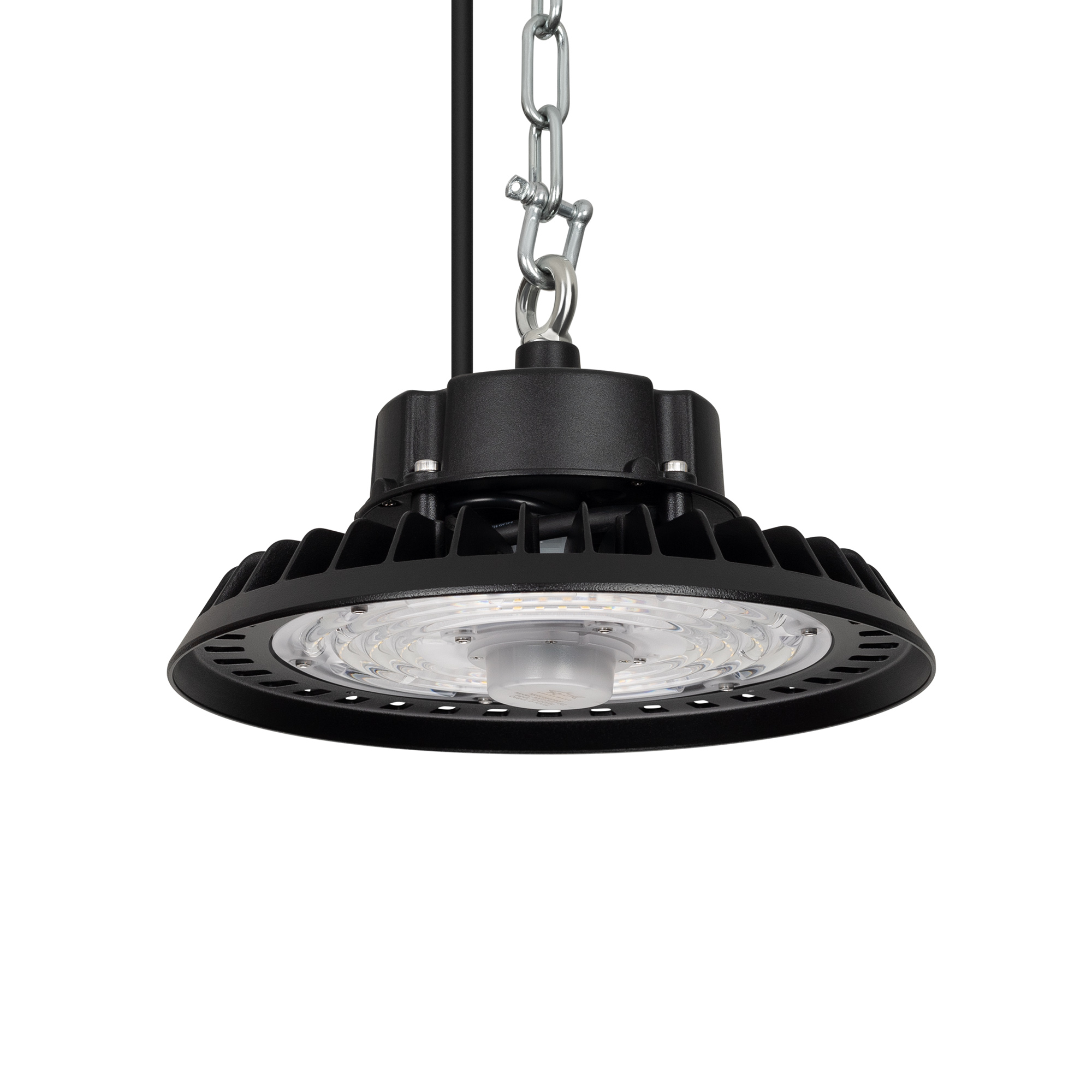 Светильник для освещения складских и промышленных помещений. Мощность 100W, напряжение питания AC 120-270V/50Hz. CRI 80. Тип светодиодов SMD2835, с групповой оптической линзой. Цвет свечения ДНЕВНОЙ 5000K, световой поток 15000 Lm, угол рассеивания 90°. Доступно управление по протоколу 0-10В. Цвет корпуса черный, линза из поликарбоната, степень влагозащиты IP65. Габариты Ф260xH140мм. Рым-болт в комплекте. Датчик настраивается с помощью пульта 052018 (один на все датчики). Длина кабеля питания 900 мм.